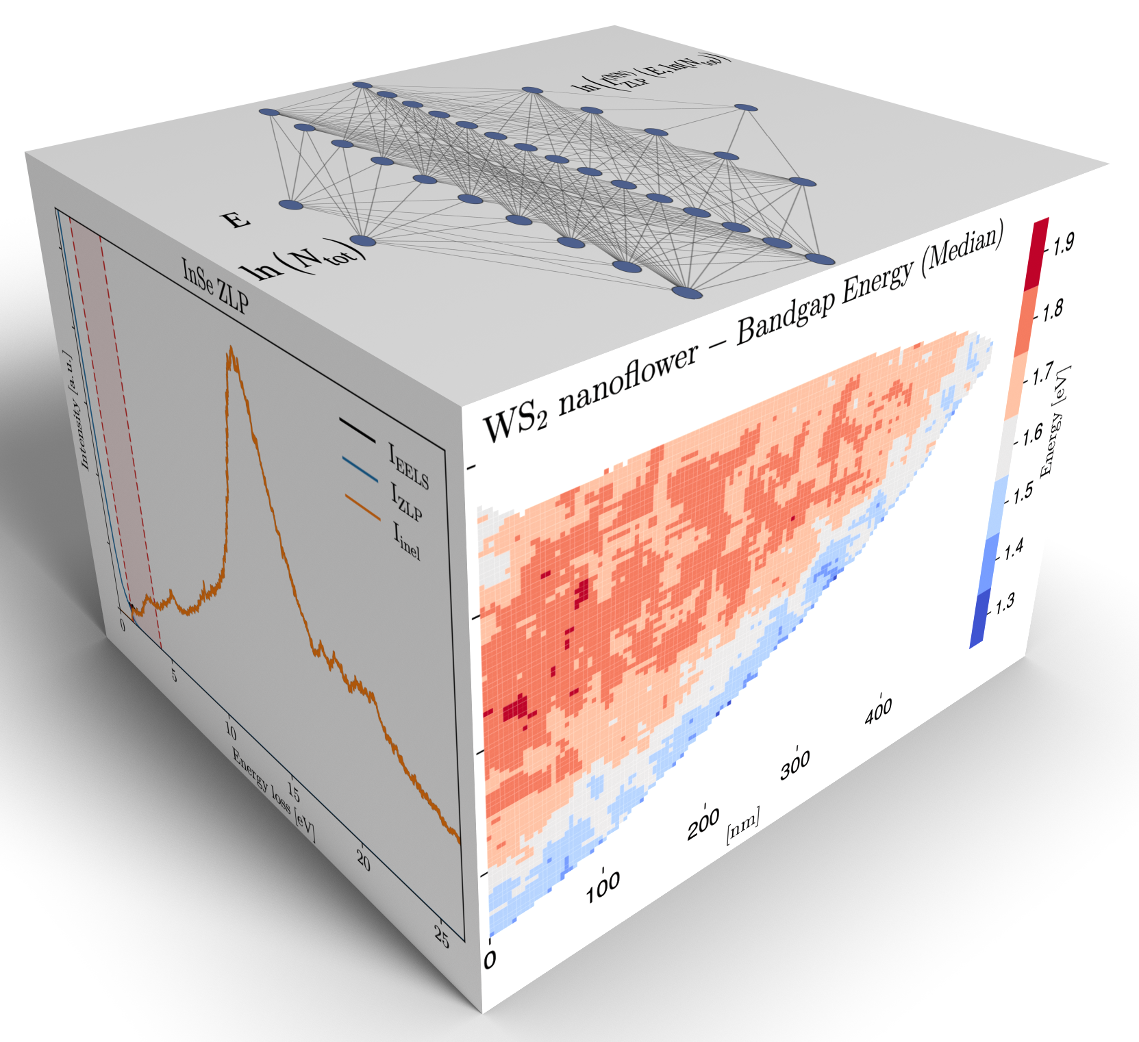 We propose a new method that uses machine learning techniques to accurately determine the bandgap and complex dielectric function of 2D materials with a high spatial resolution of a few nanometers. This approach allows for the automation of processing and interpretation of spectral images obtained from electron energy loss spectroscopy. Overall, this strategy presents a powerful tool for the characterization of 2D materials.