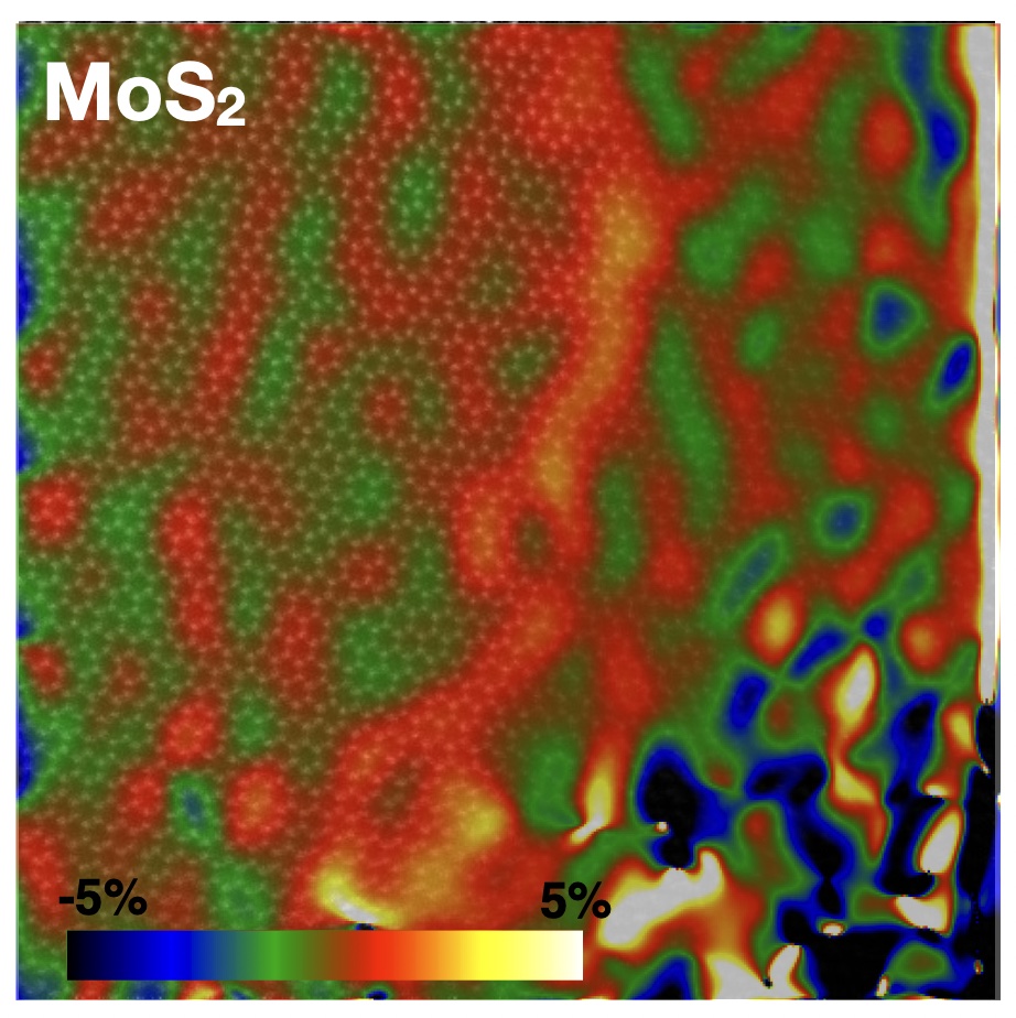 We examine edge strain in MoS2 flakes using TEM, GPA, and EELS. We report that different edge structures produce different levels of strain and that edge curvature affects the type of strain. The study aims to understand the relationship between edge strain and electronic behaviour in MoS2 flakes.
